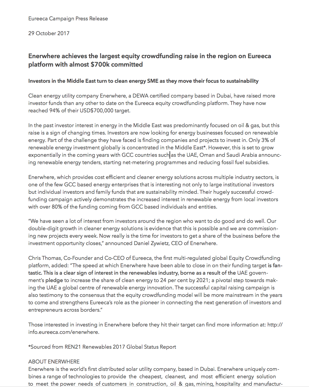Chris Thomas, Co-Founder and Co-CEO of Eureeca, the first multi-regulated global Equity Crowdfunding platform, added: “The speed at which Enerwhere have been able to close in on their funding target is fantastic. This is a clear sign of interest in the renewables industry, borne as a result of the UAE government’s pledge to increase the share of clean energy to 24 per cent by 2021; a pivotal step towards making the UAE a global centre of renewable energy innovation. The successful capital raising campaign is also testimony to the consensus that the equity crowdfunding model will be more mainstream in the years to come and strengthens Eureeca’s role as the pioneer in connecting the next generation of investors and entrepreneurs across borders.”