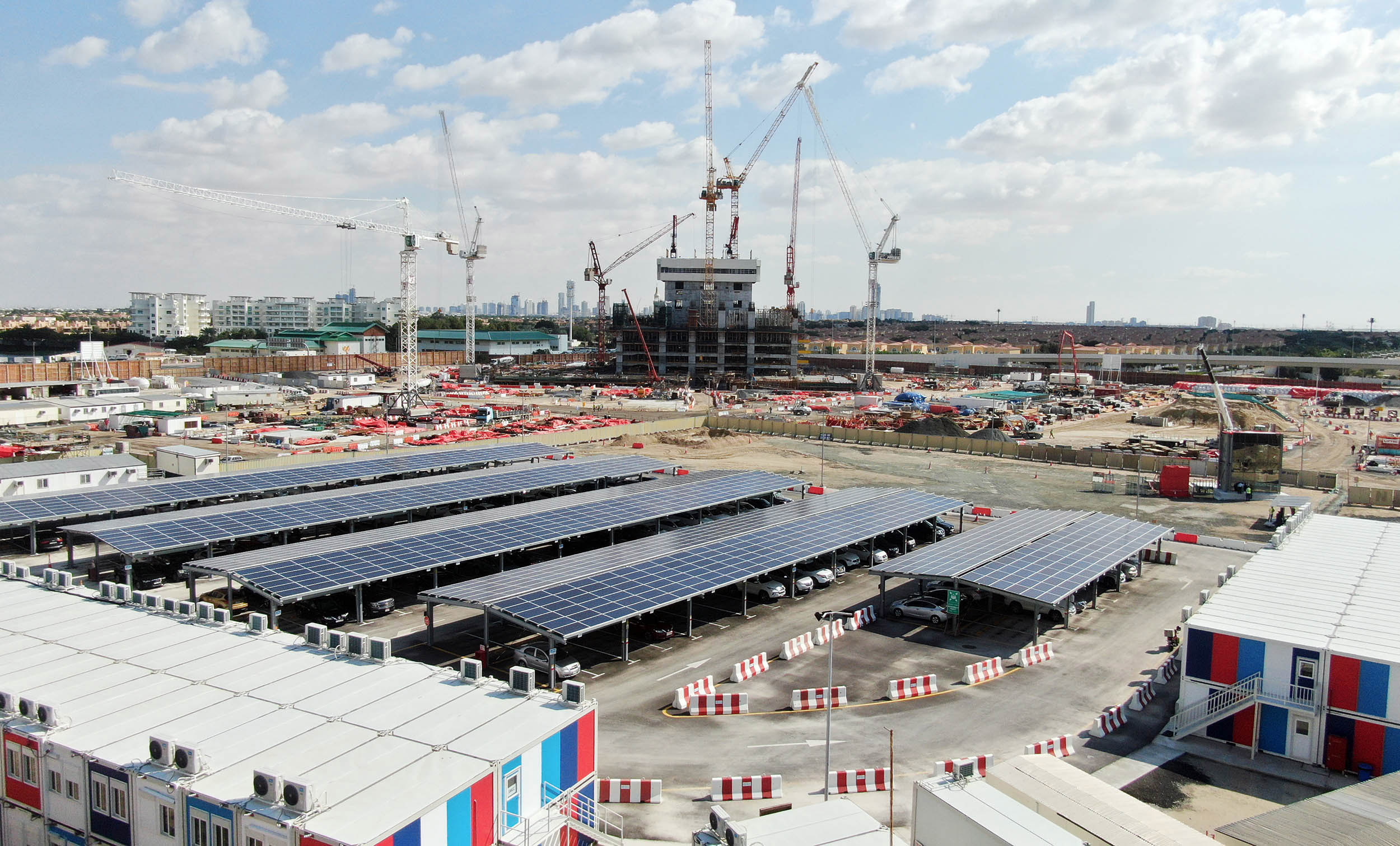 To provide cost and emissions savings, Enerwhere engineering team using its experience and familiarity with loads in the construction industry introduced power management and renewable energy into their power generation mix. The site is now powered solar-diesel-hybrid microgrid, comprising of 500 kWp of solar panels and relies on technology, engineering, and data analysis to deliver clean, renewable and reliable power to site. The system fully powers the site offices, site utilities and even power-heavy applications such as tower cranes, man hoists and pumps via a centralized medium voltage network. To integrate the solar power into the microgrid, proprietary state-of-the-art power management and control system is utilized, which provides real-time monitoring of site power requirements and optimizes the solar penetration by controlling the generators, the solar system and the loads. The system has reduced CO2 emissions by over 300 tonnes while providing BESIX cost savings of over AED 200,000 since its commissioning in March 2019.