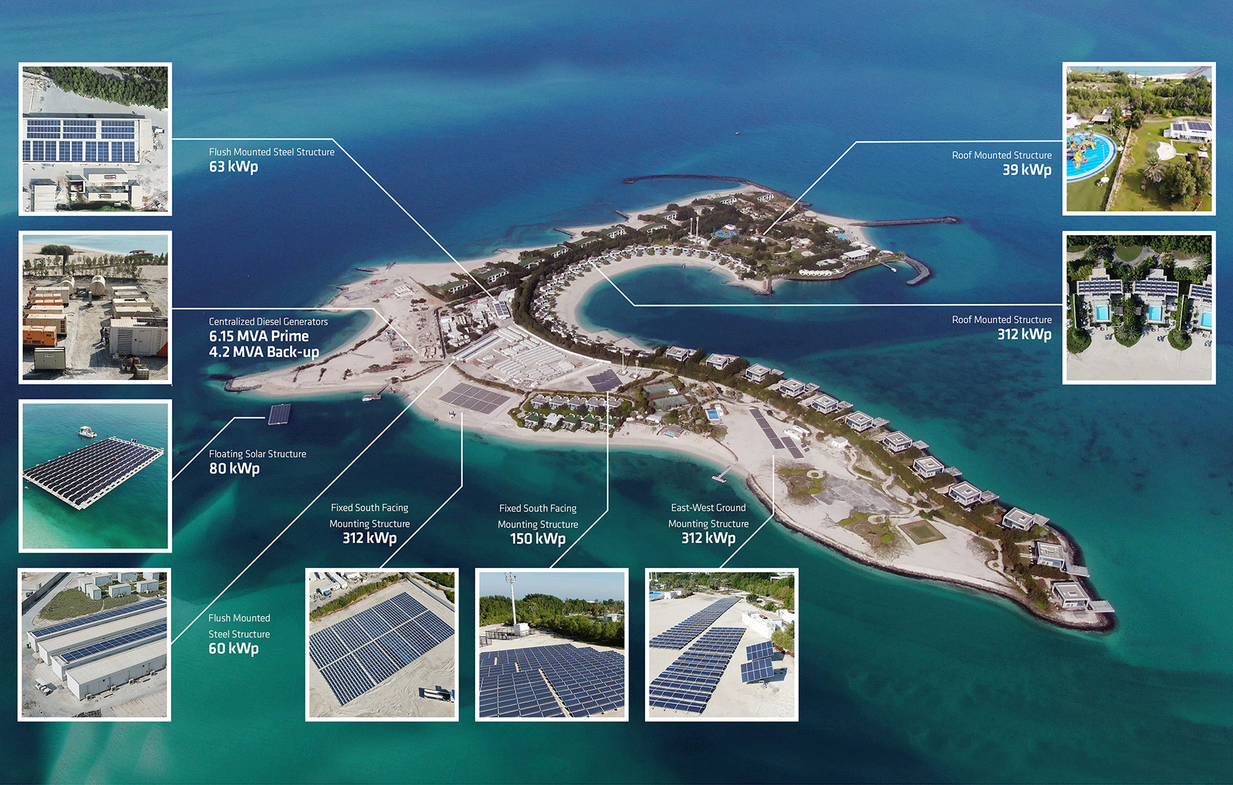 Due to the off-shore location, the island had been powered by diesel generators for several years. In a quest to reduce the cost and environmental impact of the power generation on the island, Zaya has contracted Enerwhere to supply the power on the island on the basis of a Power Purchase Agreement (PPA). The engineers deployed a customized solar-diesel hybrid system to the island in July 2016, designed to minimize the visual impact on the luxury island atmosphere. The solar plants are largely hidden on the roofs of utility buildings and back-of-the-house areas, with only a low-profile east-west facing solar system visible from the south beach.